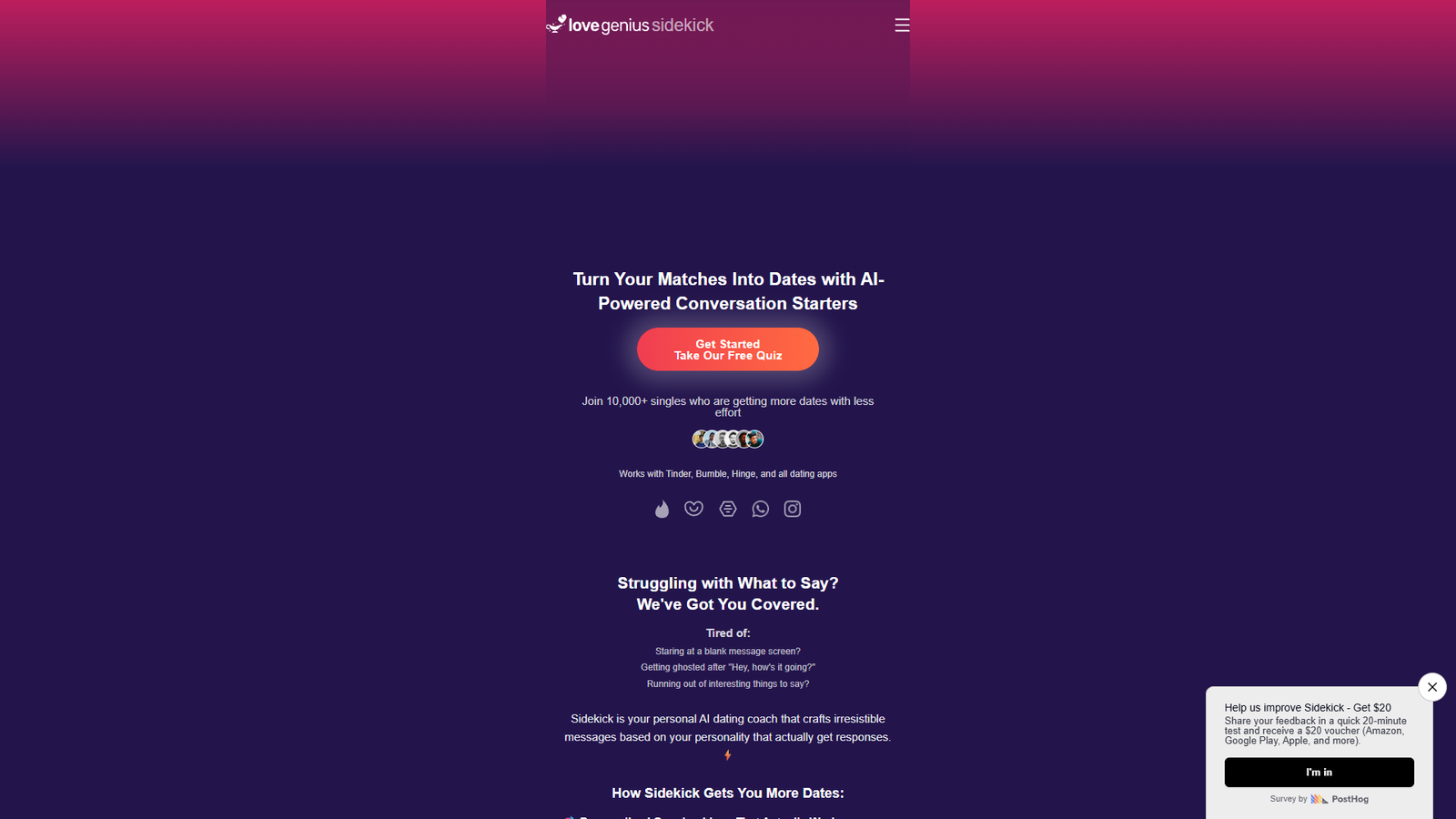 LoveGenius Sidekick — это персональный AI-коуч по знакомствам, который помогает превратить совпадения в реальные свидания. Инструмент подбирает фразы и сообщения под ваш стиль общения и цели, чтобы диалоги в Tinder, Bumble, Hinge и других приложениях не заканчивались на «Привет, как дела?».