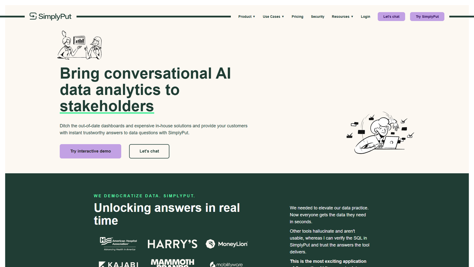 SimplyPut — это платформа для разговорной AI-аналитики данных, которая заменяет устаревшие дашборды и сложные BI-системы простым диалогом на естественном языке. Вместо того чтобы ждать отчётов от аналитиков или разбираться в громоздких панелях, пользователи просто задают вопросы о данных и мгновенно получают точные, проверяемые ответы.