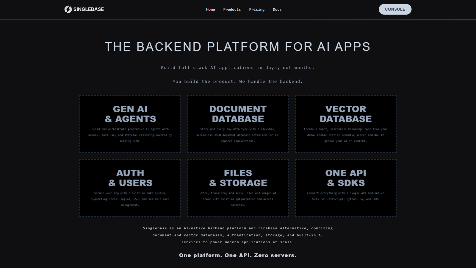 Singlebase — это комплексная backend‑платформа для создания AI‑приложений, объединяющая в одном месте векторную базу данных, NoSQL‑документное хранилище, аутентификацию и сторидж. Разработчики могут запускать полнофункциональные приложения с ИИ за дни, а не месяцы, не тратя время на сбор и поддержку разрозненной инфраструктуры.