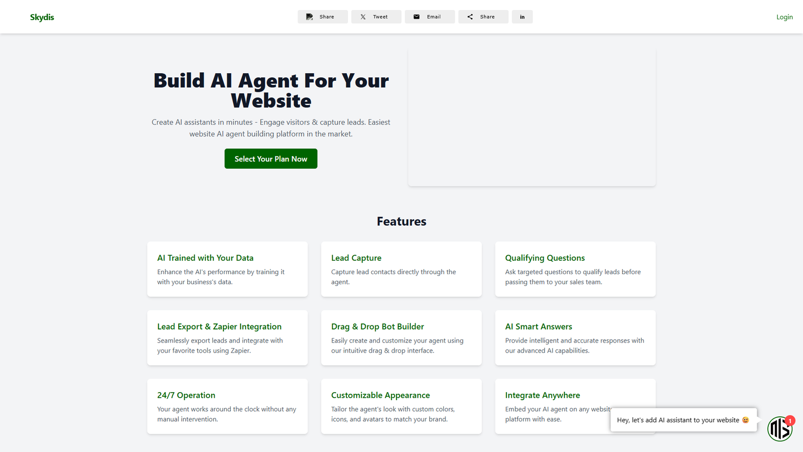 Skydis — это платформа для создания AI-агентов для сайта без кода. С её помощью вы за несколько минут запускаете умного ассистента, который отвечает на вопросы посетителей, собирает контакты и помогает продавать больше.
