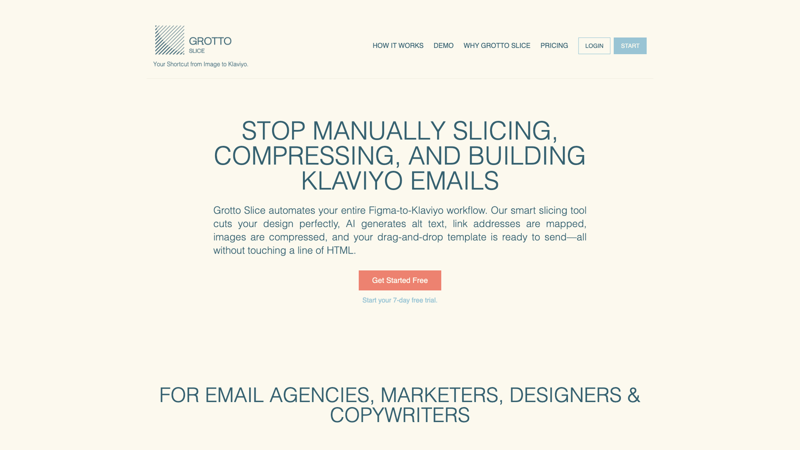 Grotto Slice автоматизирует путь от макета в Figma до готового письма в Klaviyo. Инструмент берёт единое изображение письма, нарезает его на блоки, сжимает картинки и собирает drag-and-drop шаблон без ручной верстки.