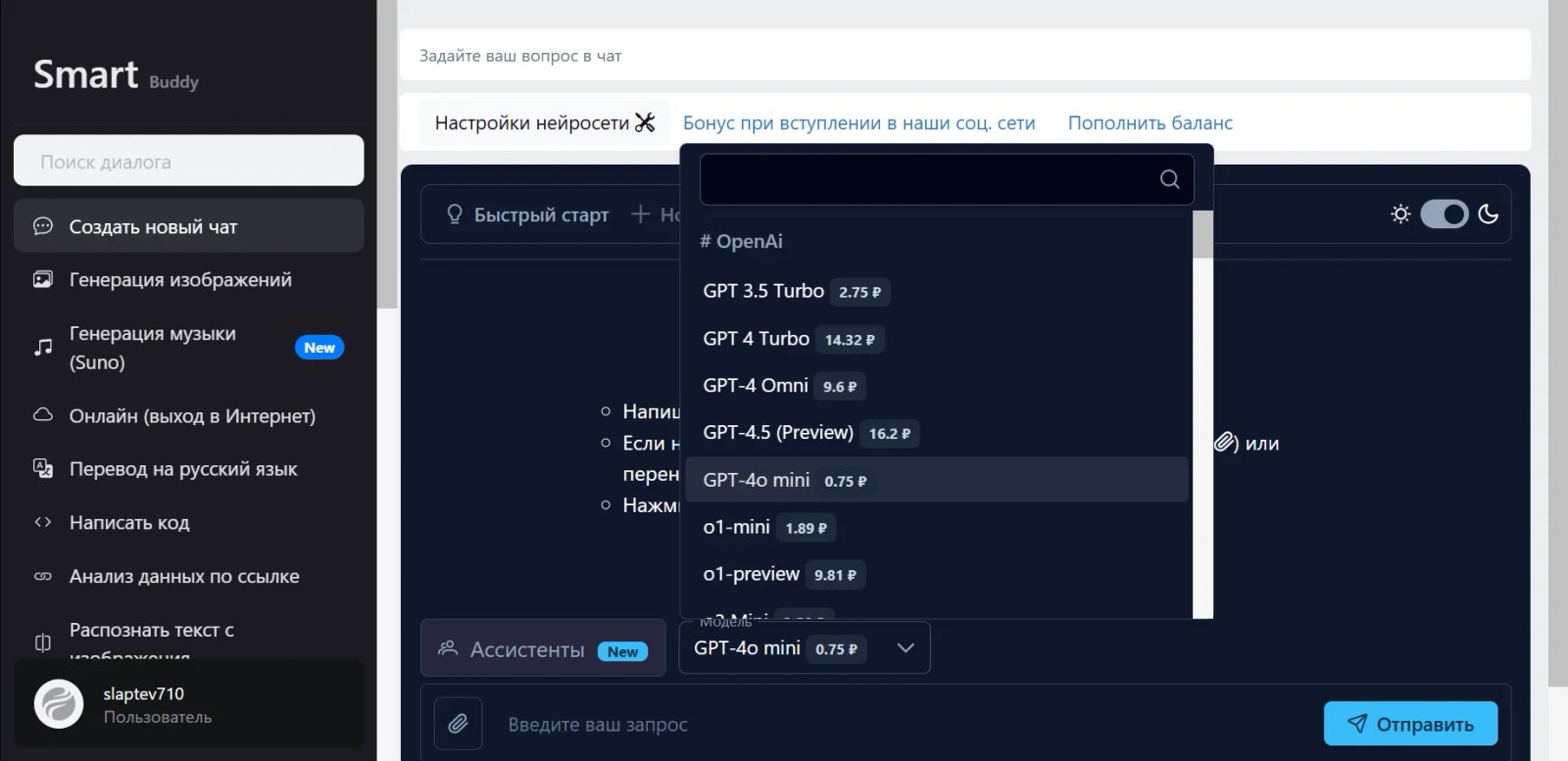 Нейросеть SmartBuddy интегрирует более 20 языковых моделей, включая DeepSeek, Claude 3.7 Sonnet и Flux 1. Способна обрабатывать запросы различной сложности — от генерации кода до создания визуальных материалов.