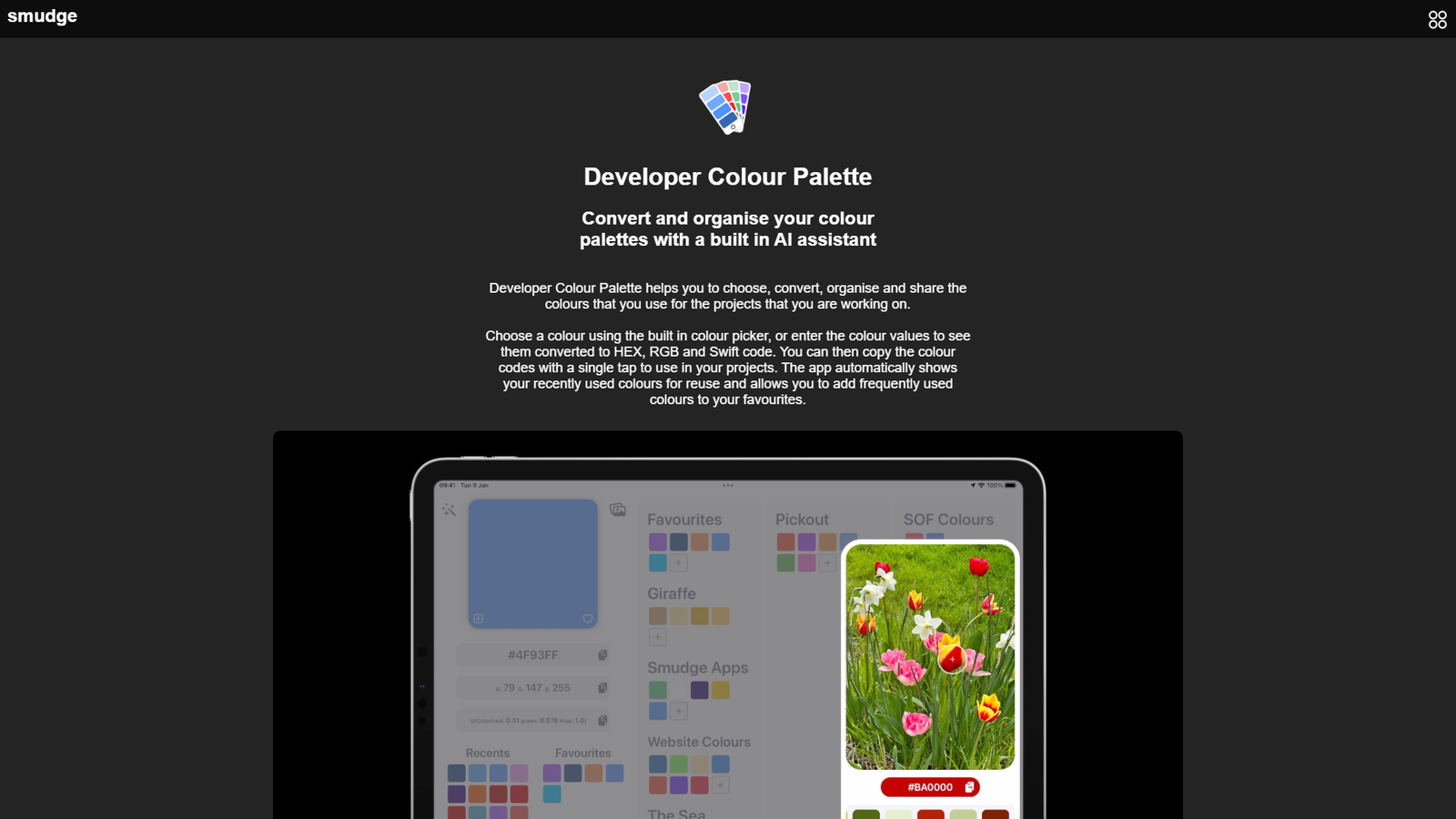 Smudge Developer Colour Palette — это удобное приложение для разработчиков и дизайнеров, которое помогает работать с цветами быстрее и точнее. Встроенный AI-ассистент упрощает выбор, конвертацию и организацию цветовых палитр для ваших проектов.