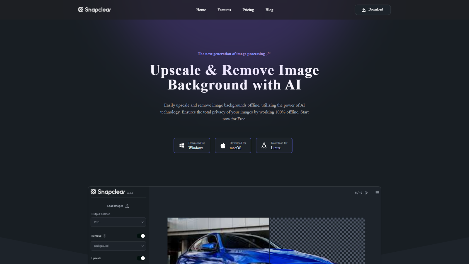 Snapclear — это десктопное приложение на базе ИИ для апскейла и удаления фона с изображений, которое работает полностью офлайн. Сервис помогает быстро улучшать качество фотографий и избавляться от фона без потери конфиденциальности.