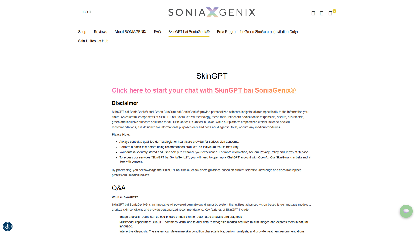 SkinGPT — это диалоговый ИИ-помощник по уходу за кожей от SoniaGenix. Пользователь общается с нейросетью в формате чата и получает персонализированные рекомендации на основе введённых данных о коже, образе жизни и текущем уходе.