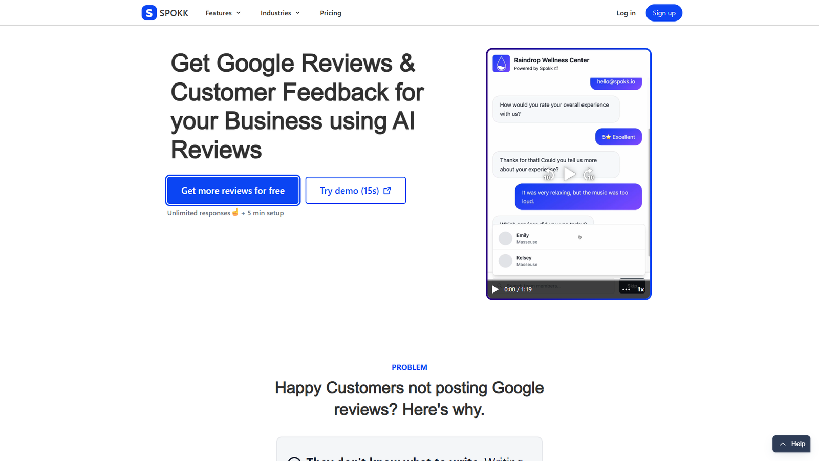 Spokk помогает компаниям получать больше отзывов в Google и собирать обратную связь от клиентов с помощью ИИ. Сервис решает типичную проблему: довольные покупатели редко находят время, чтобы написать развернутый комментарий, даже если опыт был положительным.