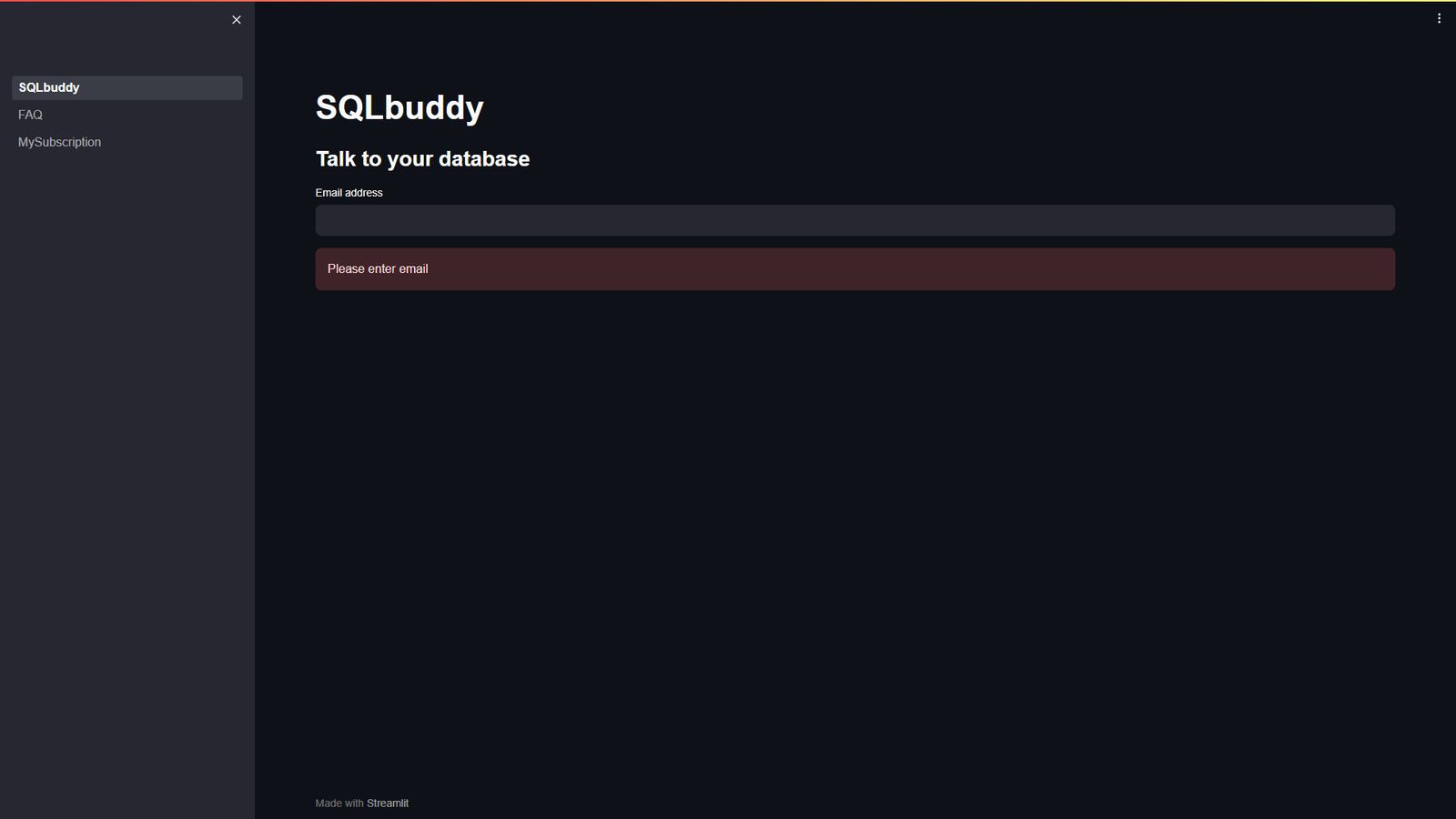 Сервис работает через простой веб-интерфейс, созданный на Streamlit. Доступ к функционалу осуществляется по email: вы указываете адрес, после чего можете использовать SQLbuddy для генерации и уточнения запросов. Такой формат делает инструмент удобным для быстрого доступа из браузера без сложной установки и настройки.