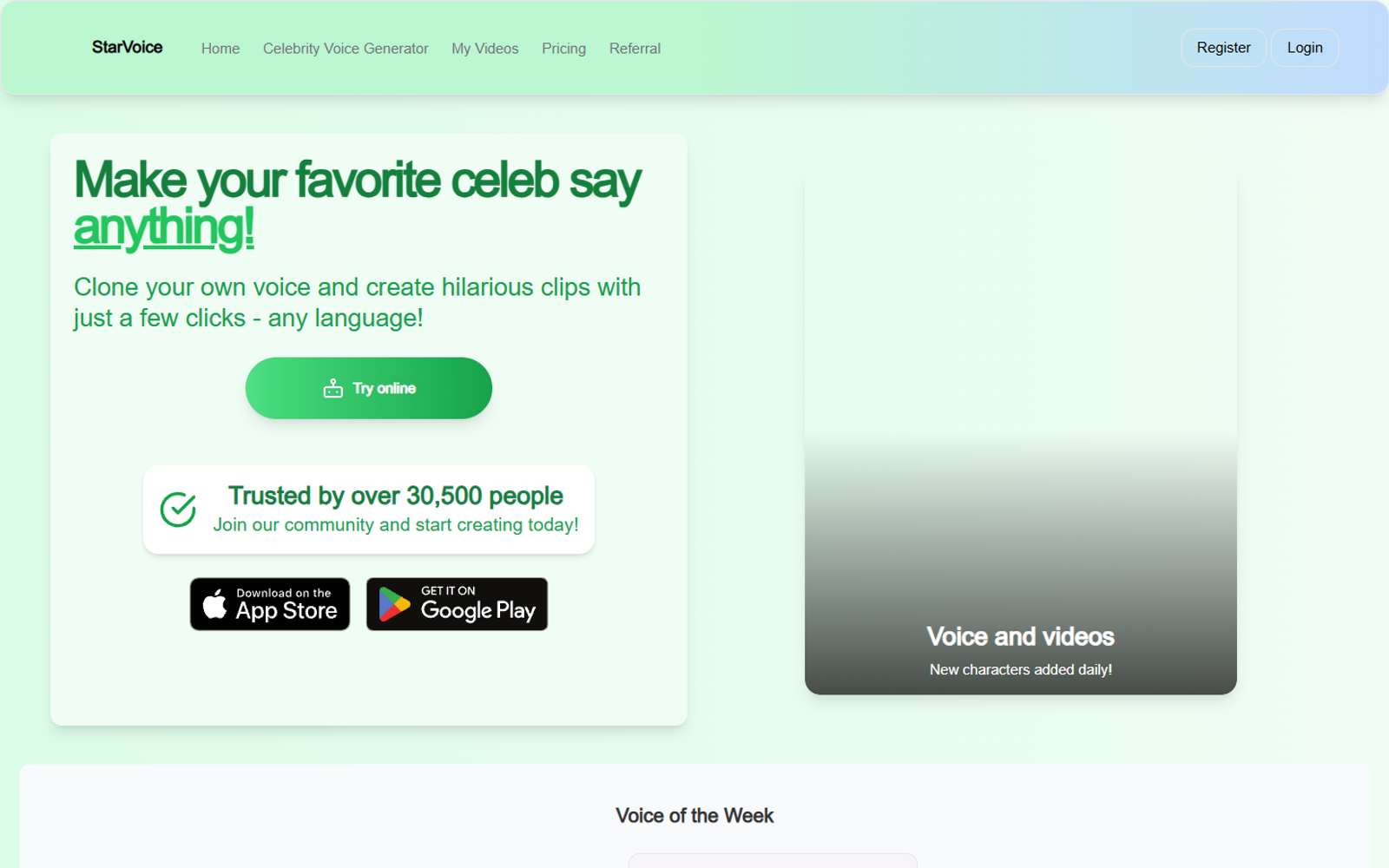 StarVoice — онлайн-инструмент для генерации голосов знаменитостей и создания коротких развлекательных клипов. Пользователь выбирает персонажа из готовой коллекции или загружает собственный голос для клонирования, а затем вводит текст и получает озвучку в нужном стиле и на любом языке.