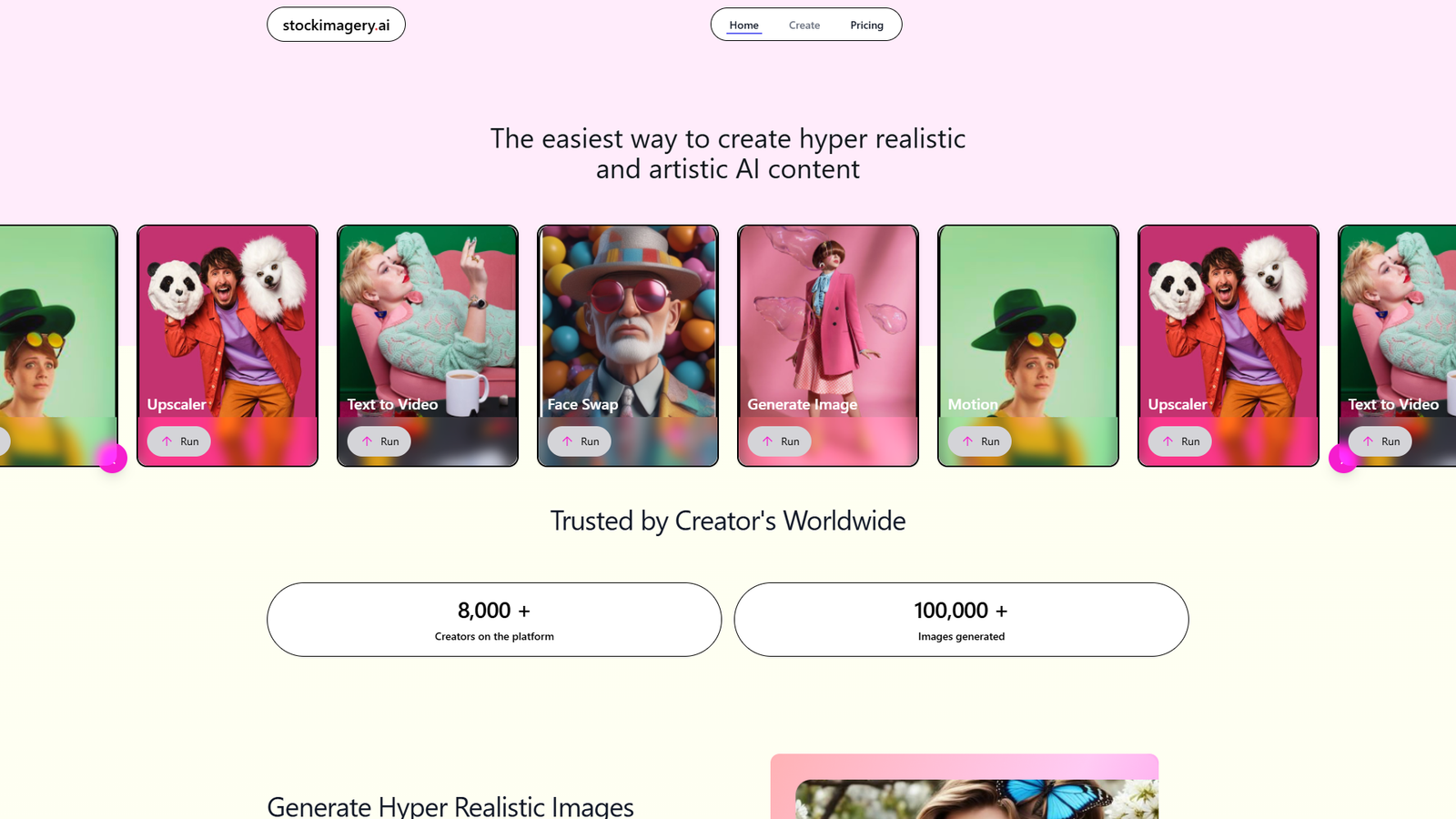 Stock Imagery AI — онлайн-инструмент для создания гиперреалистичных и художественных изображений и видео на базе нейросетей. Подходит художникам, дизайнерам, маркетологам и создателям контента, которым нужно быстро получать визуалы под задачу.