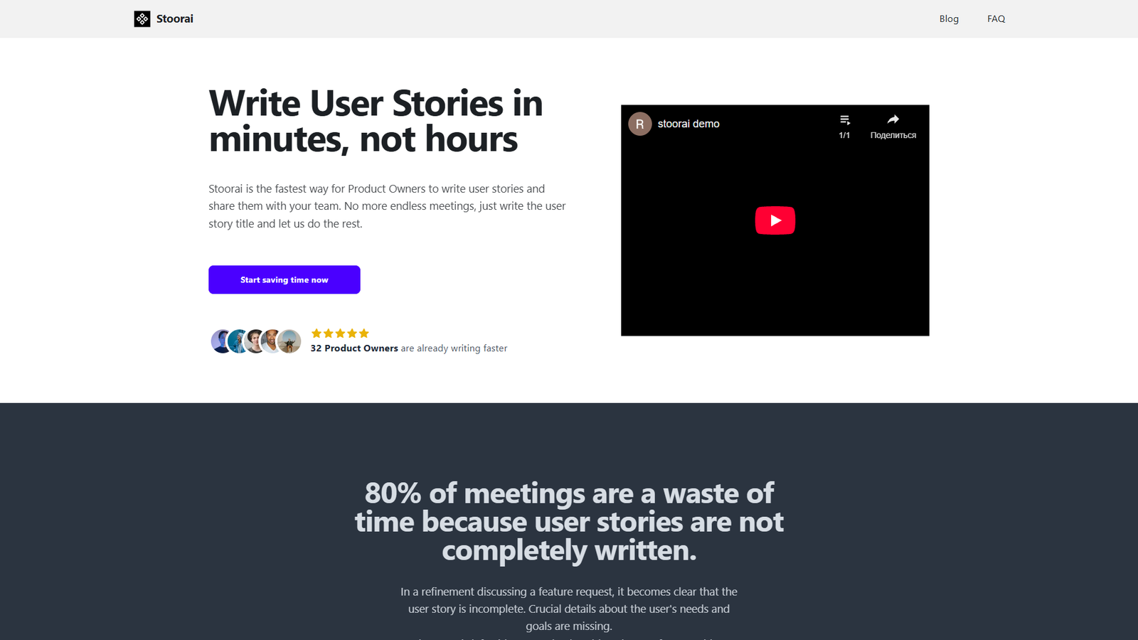 Stoorai — это AI‑инструмент для продакт-менеджеров и владельцев продукта, который помогает писать качественные user stories за минуты, а не часы. Сервис автоматизирует рутинную часть работы с требованиями и снижает количество бесконечных уточняющих встреч.