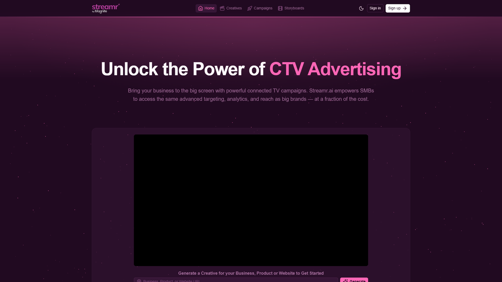 Streamr.ai помогает малому и среднему бизнесу выходить на экраны смарт‑телевизоров и CTV без сложных медиа-баингов и агентств. В одном интерфейсе собираются инструменты для создания креативов, настройки кампаний и анализа результатов.