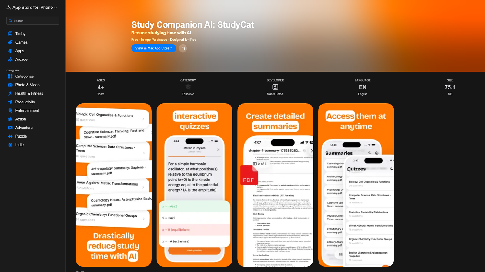 Study Companion AI: StudyCat — это умное учебное приложение, которое помогает сократить время подготовки к экзаменам с помощью ИИ. Сервис превращает любой текст в интерактивные викторины и наглядные конспекты, делая процесс обучения быстрее и увлекательнее.
