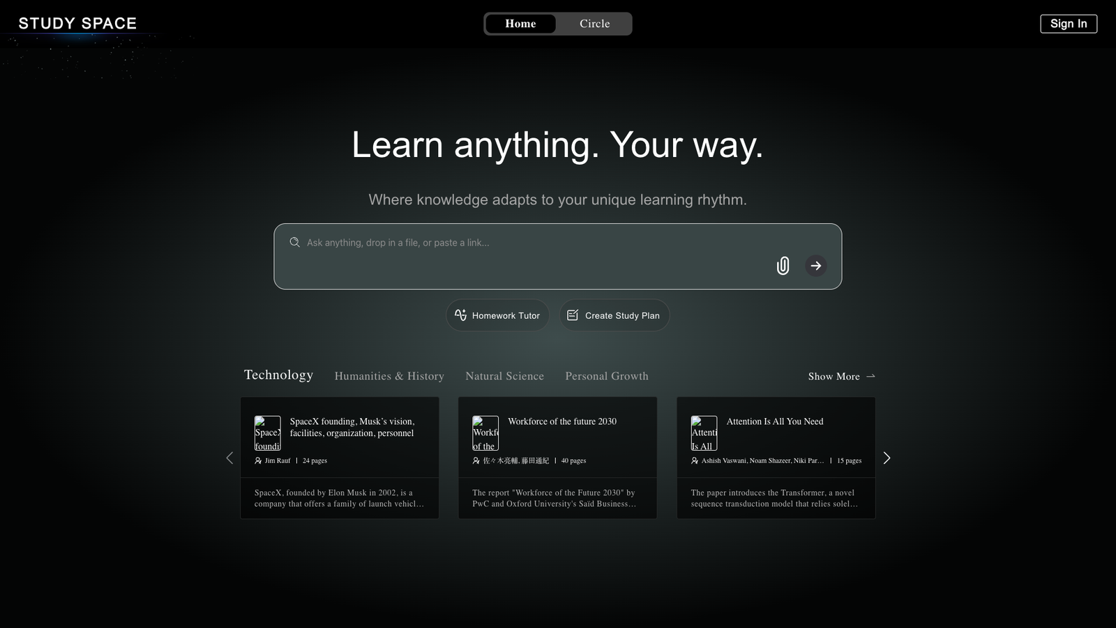 Study Space превращает любые документы в персональные лекции и учебные материалы на базе ИИ. Пользователь загружает файлы или выбирает из более чем 100 миллионов публичных документов, а система формирует структурированный курс под его темп и формат обучения.
