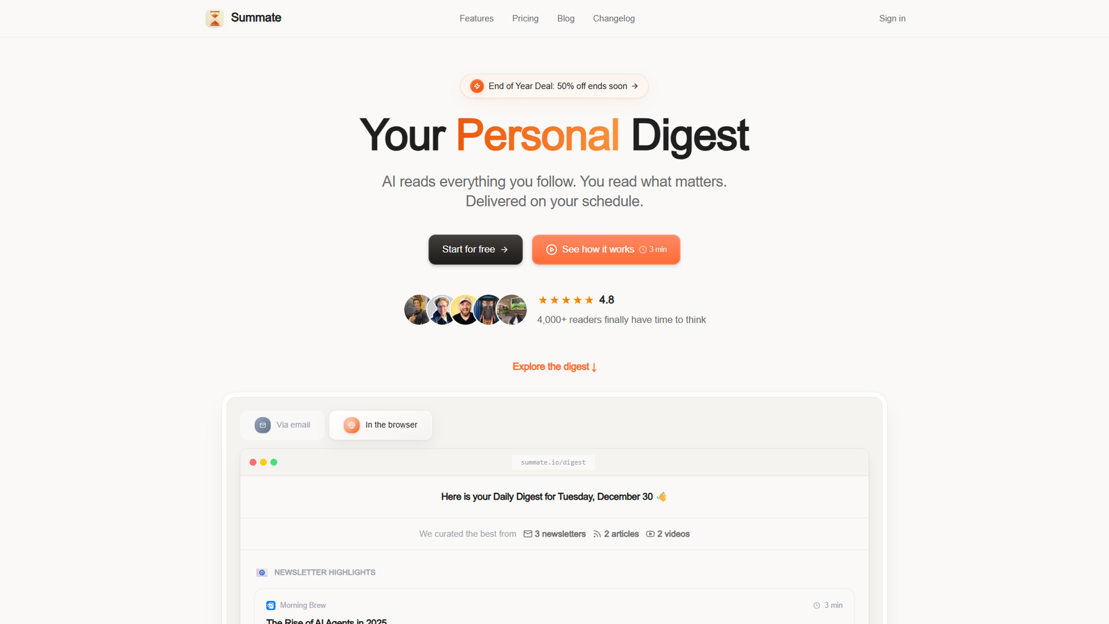 Summate — это персональный AI-диджест, который читает всё, что вы отслеживаете, и превращает хаотичный поток контента в один удобный обзор. Сервис экономит часы на чтении рассылок, статей и просмотре видео, оставляя вам только самое важное и интересное.
