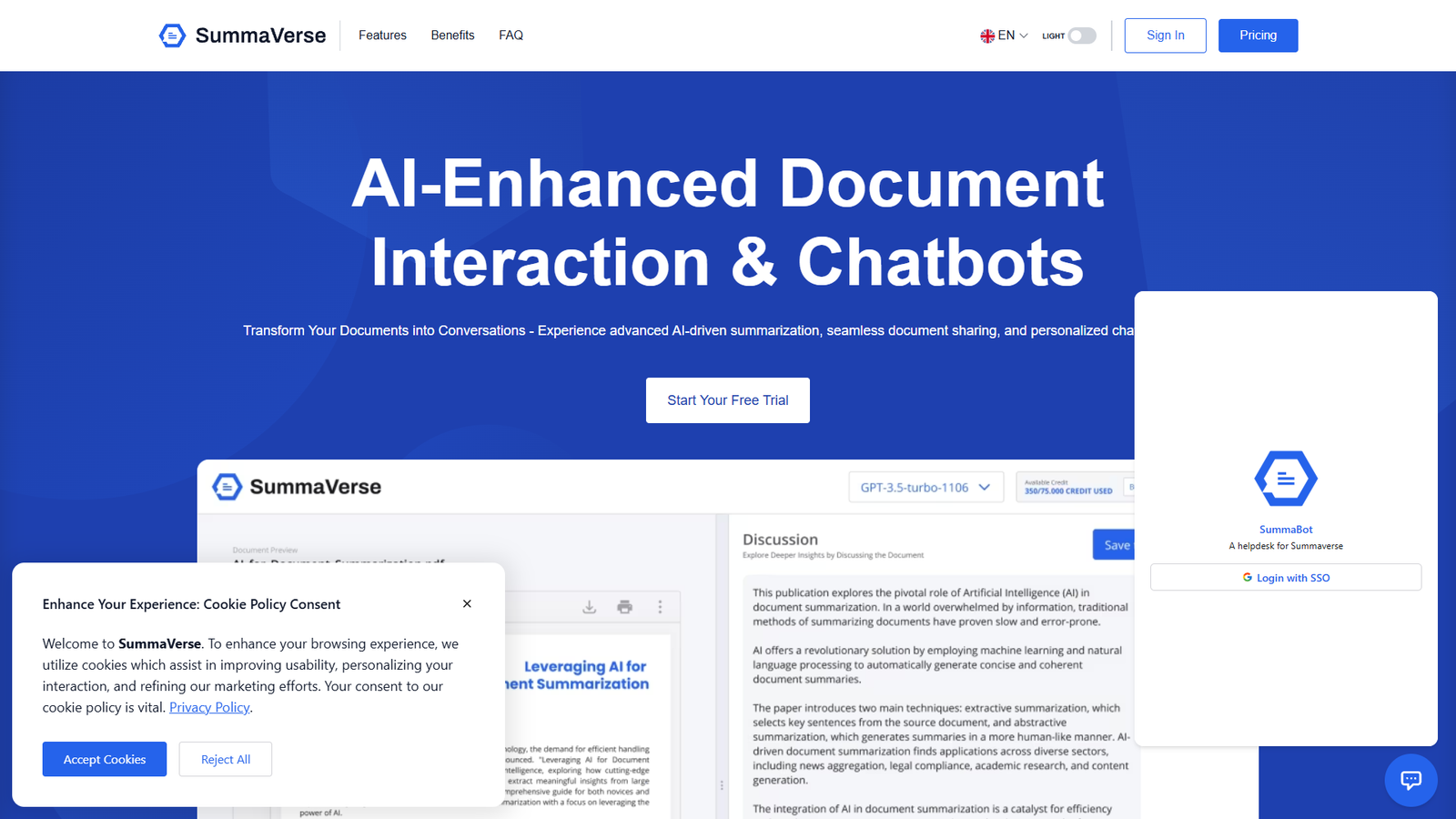 SummaVerse — это AI-платформа, которая превращает ваши документы в интерактивные диалоги. Сервис использует продвинутую технологию суммаризации, чтобы быстро выделять главное из больших текстов, отчетов, PDF и других файлов.