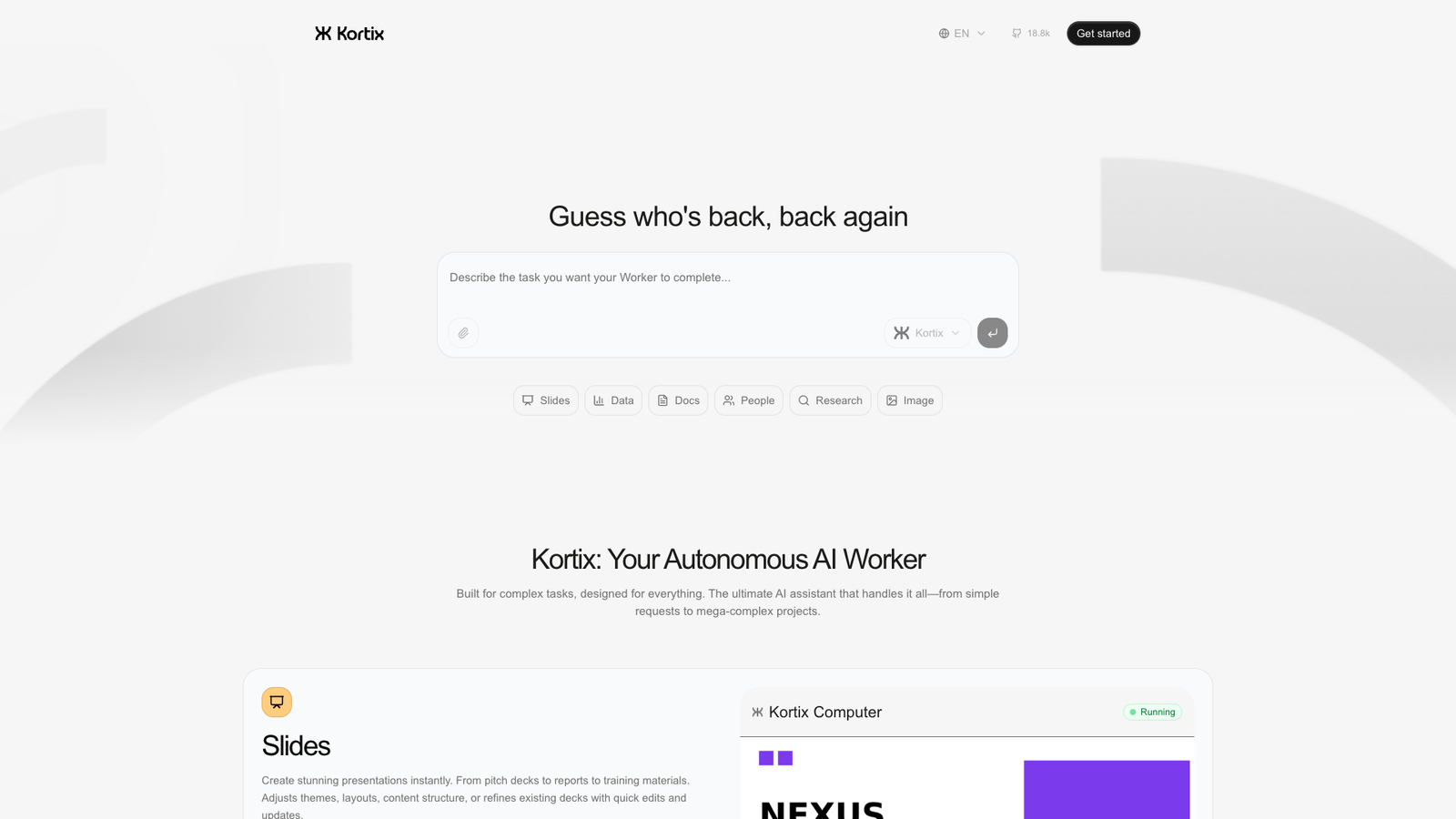 Kortix — автономный AI-«сотрудник», который берёт на себя сложные многошаговые задачи. Он работает не как обычный чат-бот, а как исполнитель, который понимает контекст, планирует шаги и доводит задачу до результата.