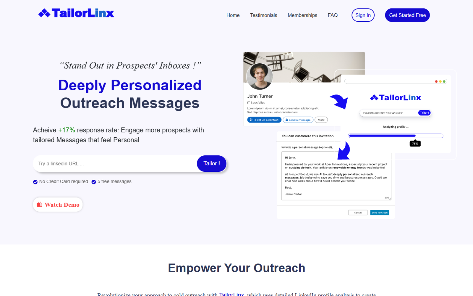 TailorLinx — это AI‑платформа для масштабируемой персонализации холодных продаж и аутрич‑сообщений. Сервис помогает выделиться в переполненных инбоксах и заменить шаблонные письма по‑настоящему персональными обращениями.