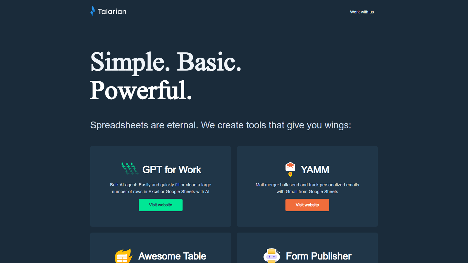 Ключевой продукт — GPT for Work, массовый AI‑агент для Google Sheets и Excel. Он помогает быстро заполнять, очищать и обрабатывать большие массивы строк с помощью искусственного интеллекта, автоматизируя рутинные операции и снижая количество ошибок.