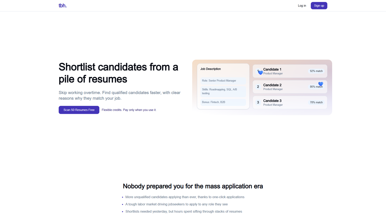 TBH — это платформа для автоматизации отбора кандидатов из большого массива резюме. Сервис помогает рекрутерам и HR-командам быстро находить наиболее подходящих соискателей для открытых позиций, не тратя часы на ручной просмотр откликов.