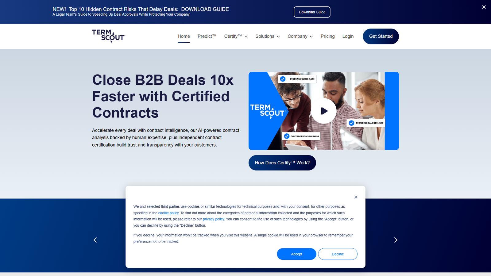 Ключевая идея TermScout — независимая сертификация договоров. Контракты проходят автоматический разбор с помощью нейросети, а затем проверку специалистами. В результате стороны получают подтверждение, что условия соответствуют рынку и не содержат скрытых рисков.