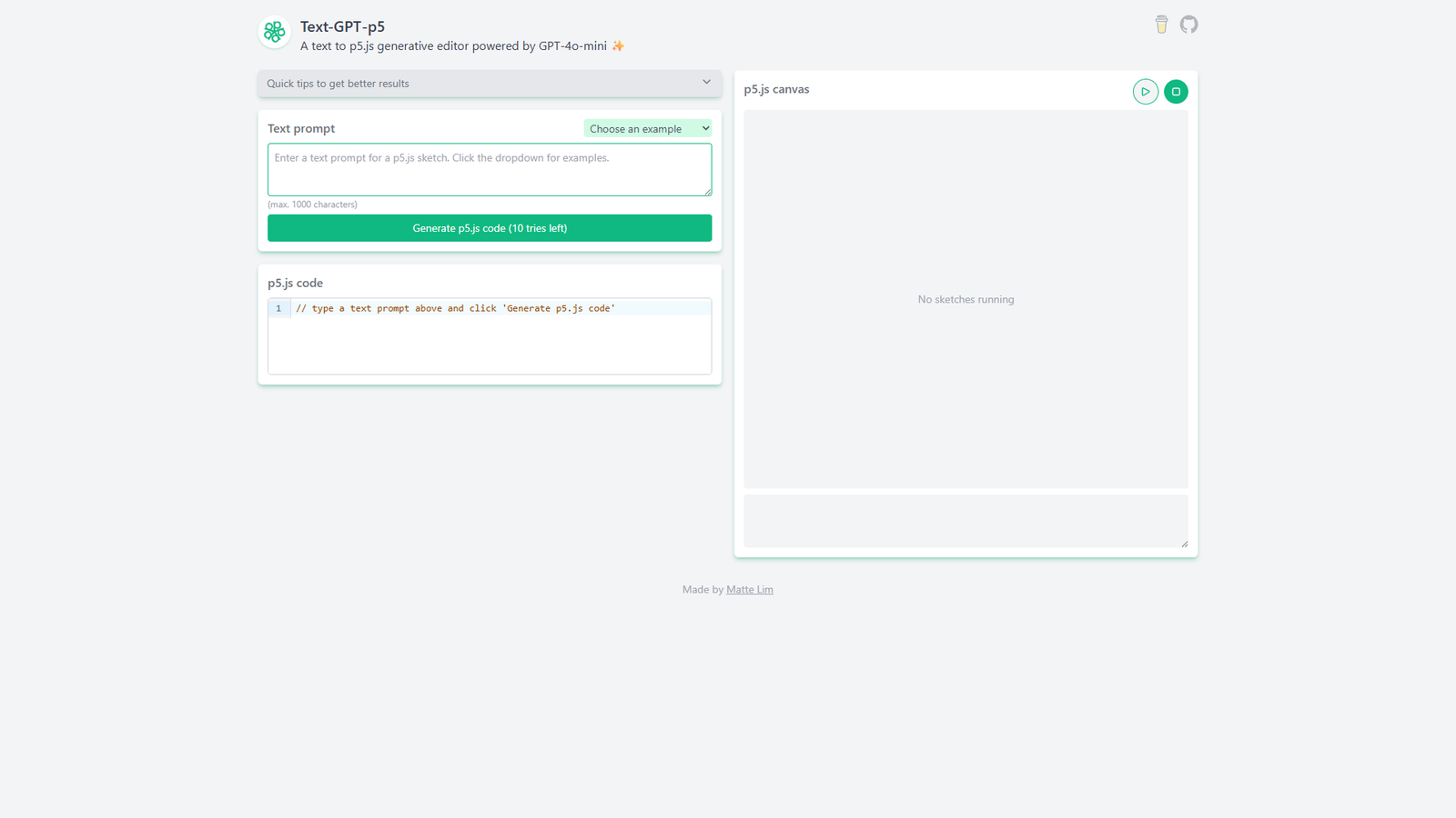 Text-GPT-p5 — это онлайн-редактор, который превращает текстовые подсказки в рабочий p5.js‑код с помощью модели GPT-4o-mini. Сервис идеально подходит для тех, кто хочет быстро создавать генеративную графику, анимации и интерактивные скетчи прямо в браузере.