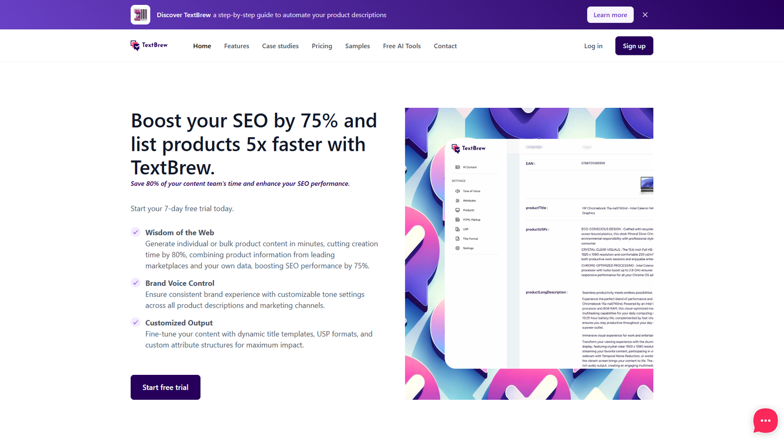 Алгоритмы TextBrew оптимизируют тексты под поисковые системы, помогая повысить SEO‑показатели до 75% и быстрее выводить новые позиции в топ. Автоматически формируются ключевые характеристики, преимущества и структурированные блоки описаний, что улучшает видимость и кликабельность карточек товара.