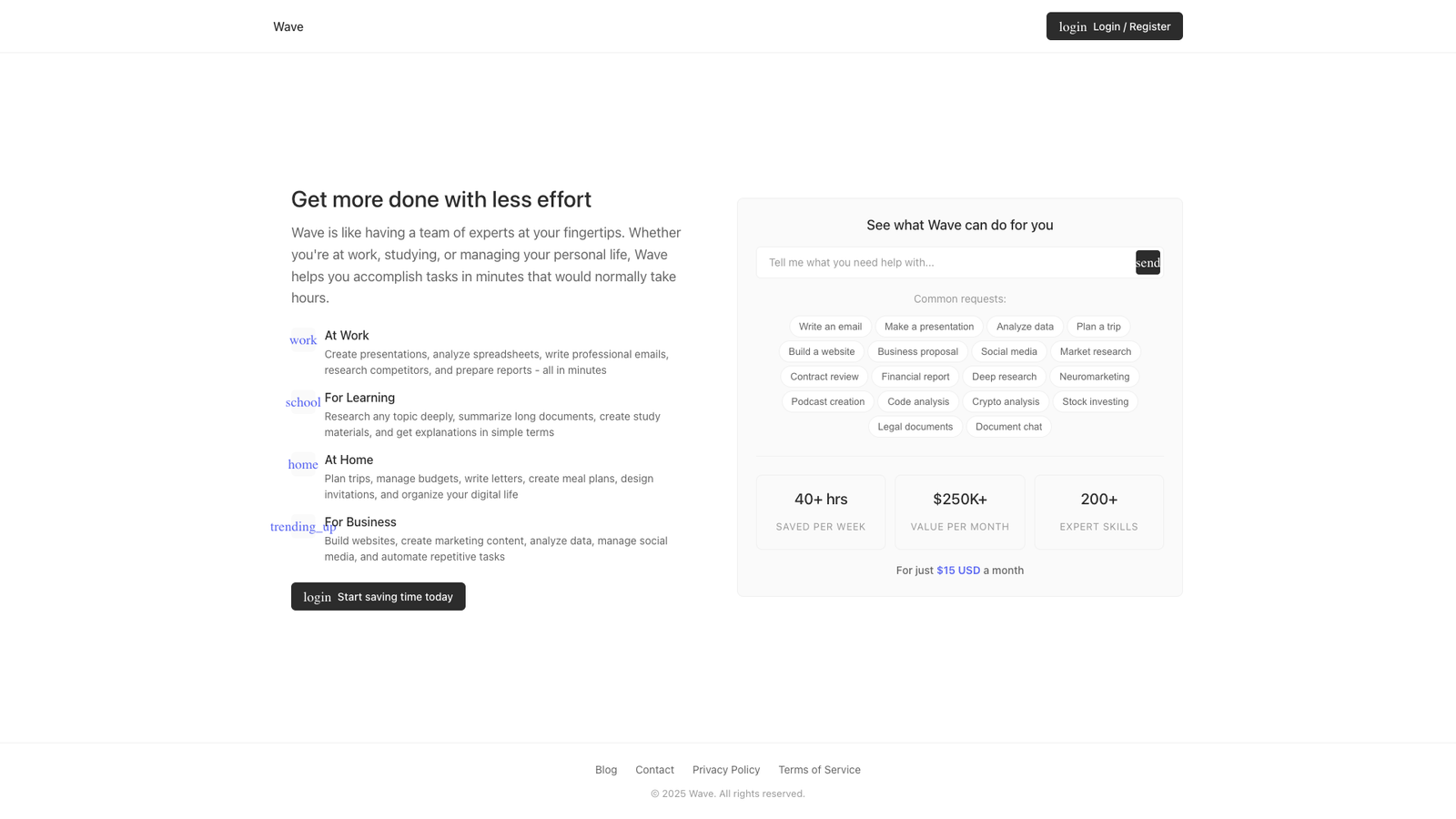 Wave — универсальный ИИ-ассистент для работы, учёбы и личных задач. Он берёт на себя рутинные операции: от анализа данных до подготовки текстов и планирования дел, сокращая время на типичные задачи с часов до минут.