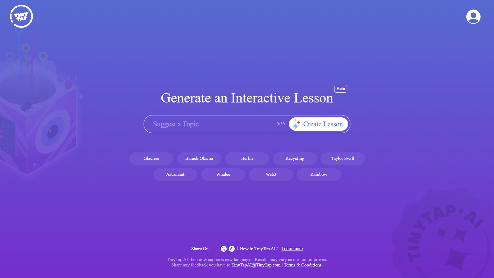 TinyTap AI — это онлайн‑платформа, которая с помощью искусственного интеллекта превращает любую тему в интерактивный урок или обучающую игру. Достаточно ввести ключевое слово или тему — от «ледники» и «Берлин» до «Тейлор Свифт» или «Web3» — и сервис сгенерирует готовый образовательный контент.