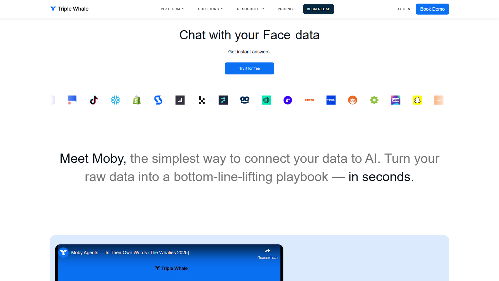 Triple Whale Moby — AI-платформа, которая помогает «разговаривать» с вашими маркетинговыми и e-commerce данными и быстро получать ответы на бизнес-вопросы.