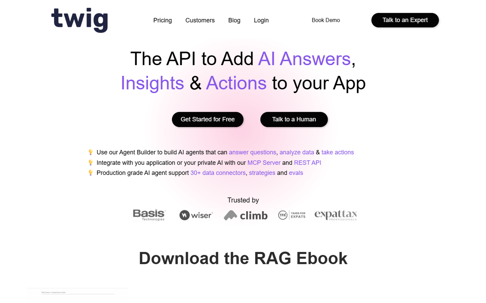 Twig — это API и конструктор AI-агентов для встраивания умных ответов, аналитики и действий прямо в ваши приложения. Разработчик собирает агента из готовых блоков, подключает источники данных и сразу получает рабочий инструмент в продакшене.