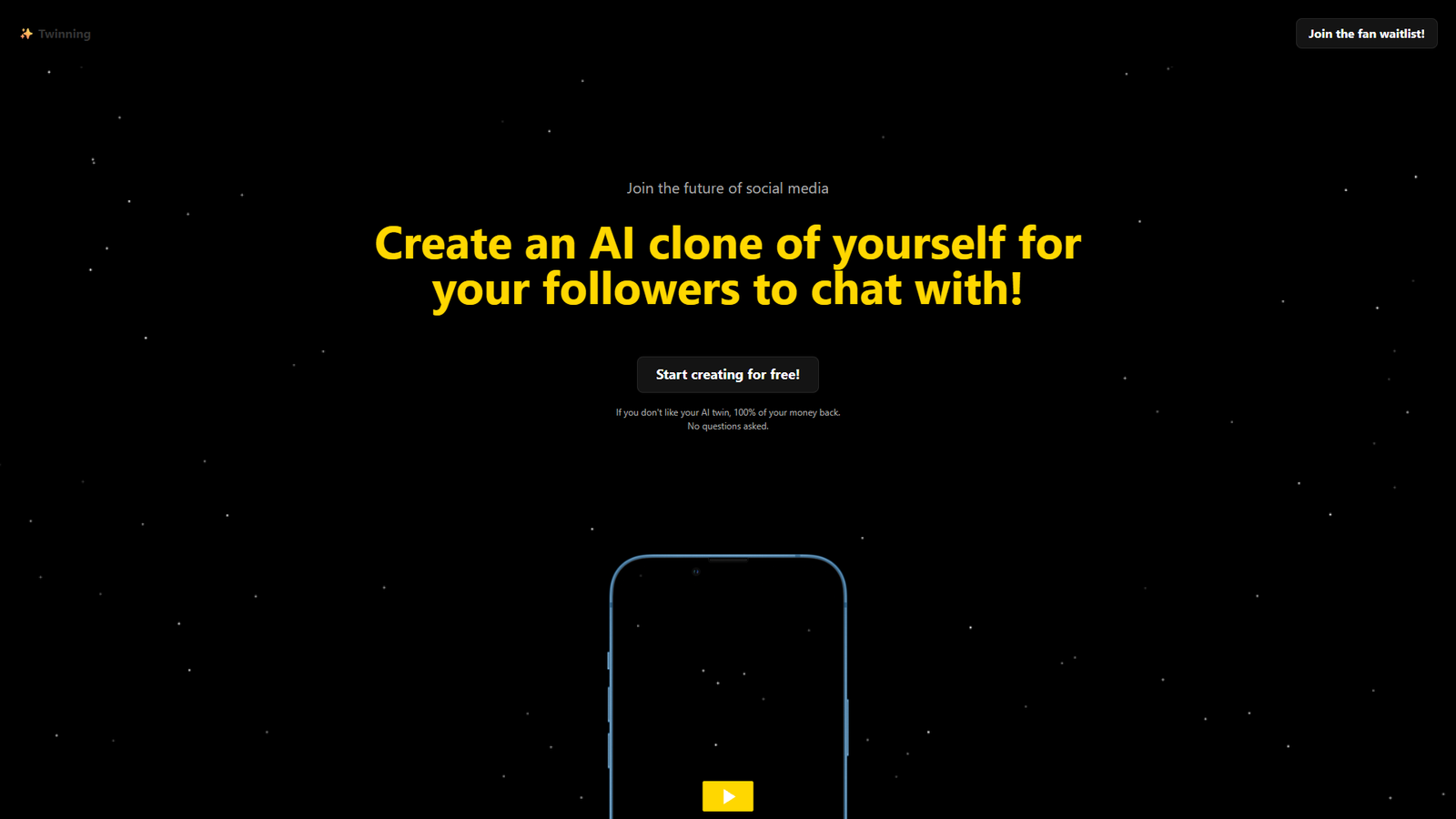 Twinning — это платформа, которая позволяет создать полноценного AI-клона себя для общения с подписчиками и фанатами. Сервис ориентирован на блогеров, стримеров, инфлюенсеров и создателей контента, которые хотят масштабировать взаимодействие с аудиторией и зарабатывать на персонализированном общении.