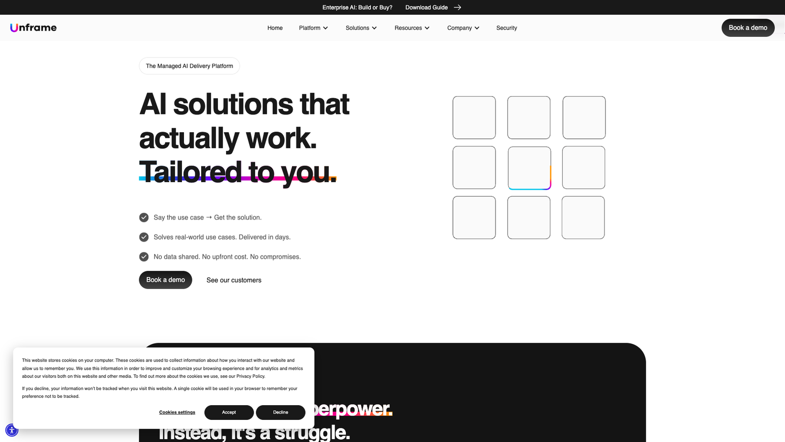 Модель работы строится вокруг концепции Managed AI Delivery: заказчик формулирует кейс, а Unframe AI берёт на себя проектирование, сборку и вывод решения в продакшн. Акцент делается на измеримом эффекте и быстрой поставке — запуск занимает дни, а не месяцы.