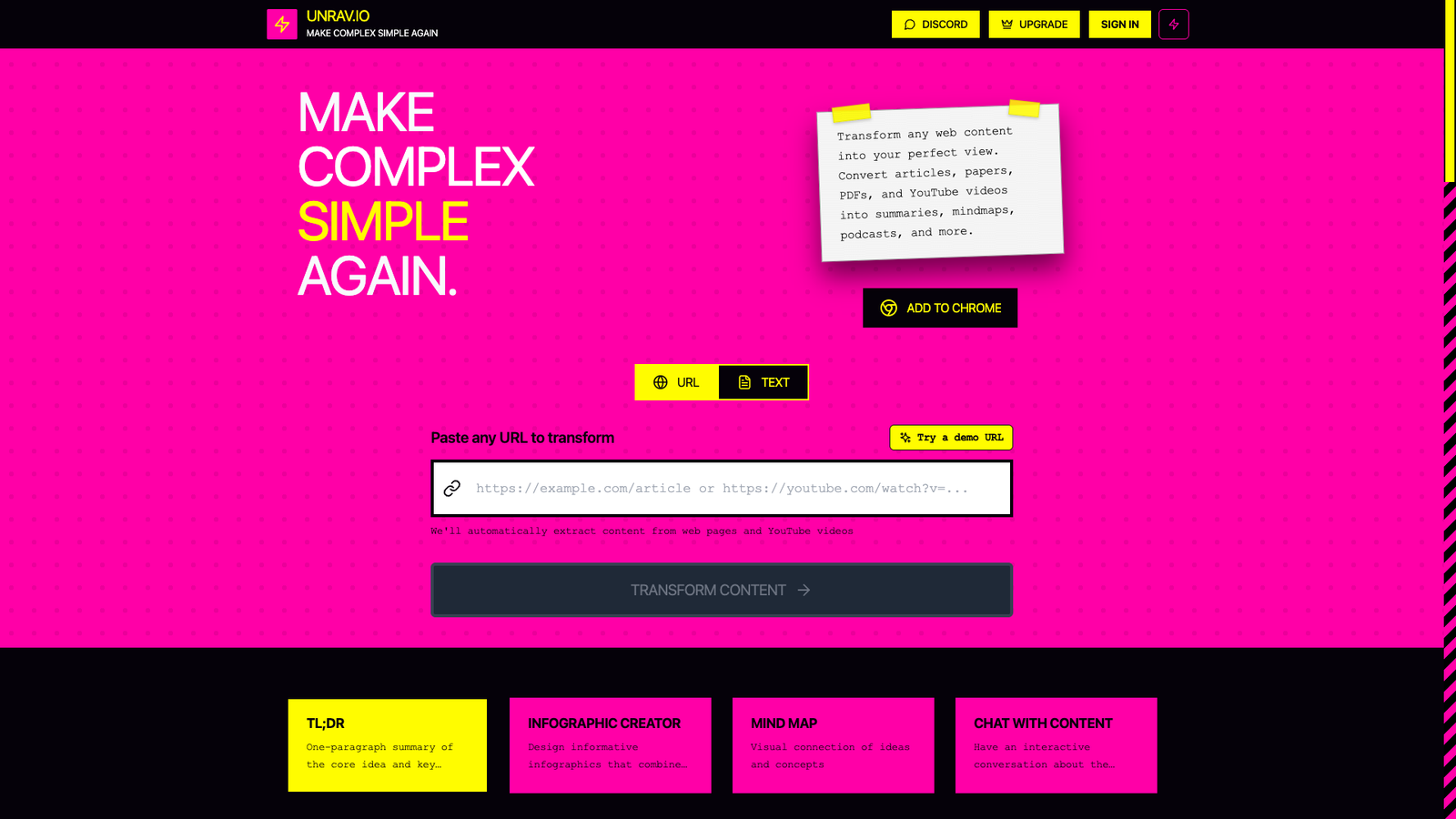unrav.io помогает разбирать сложные материалы из интернета и превращать их в наглядные форматы. Достаточно вставить ссылку на статью, научную работу, PDF или ролик YouTube — система сама извлекает содержимое и подготавливает удобный для восприятия результат.