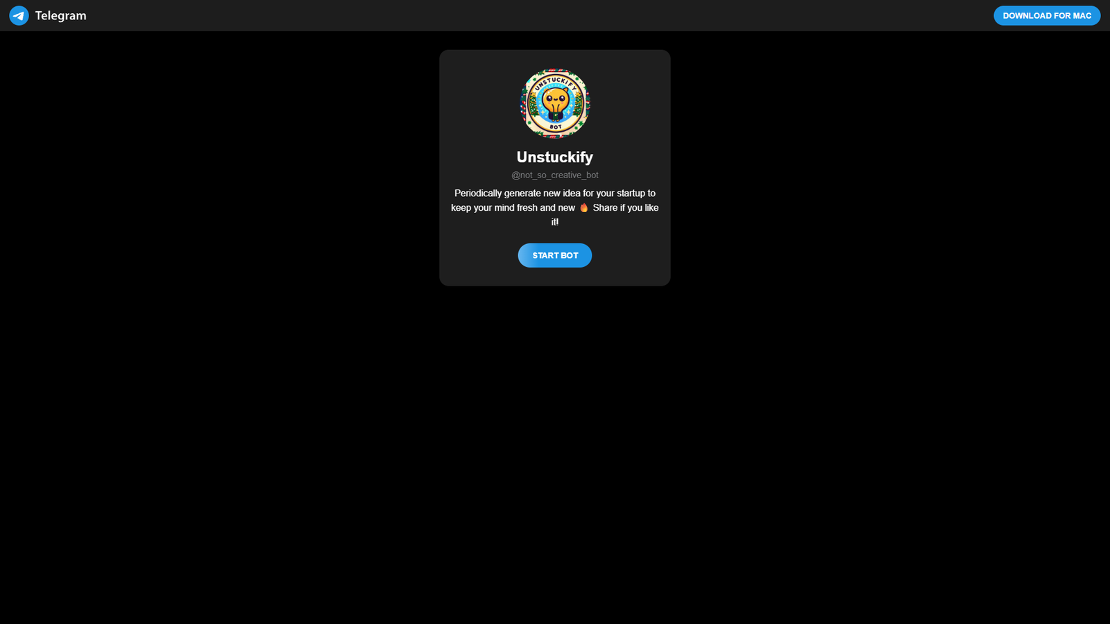 Unstuckify (@not_so_creative_bot) — это простой телеграм-бот, который помогает предпринимателям и стартаперам регулярно получать новые идеи для проектов. Сервис периодически генерирует свежие концепции, чтобы вы не «застревали» в одном направлении и могли смотреть на свой бизнес под разными углами.