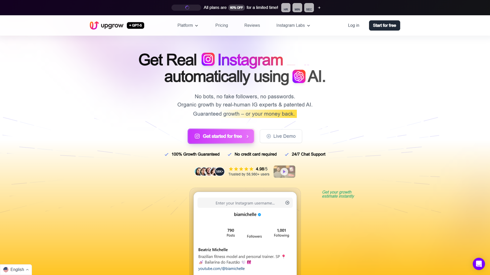 UpGrow — это AI-сервис для быстрого и безопасного роста в Instagram, который помогает получать реальных подписчиков, лайки и фанатов без ботов и накруток. Платформа сочетает запатентованный искусственный интеллект и работу команды живых Instagram-экспертов, чтобы обеспечить органический рост аккаунта.