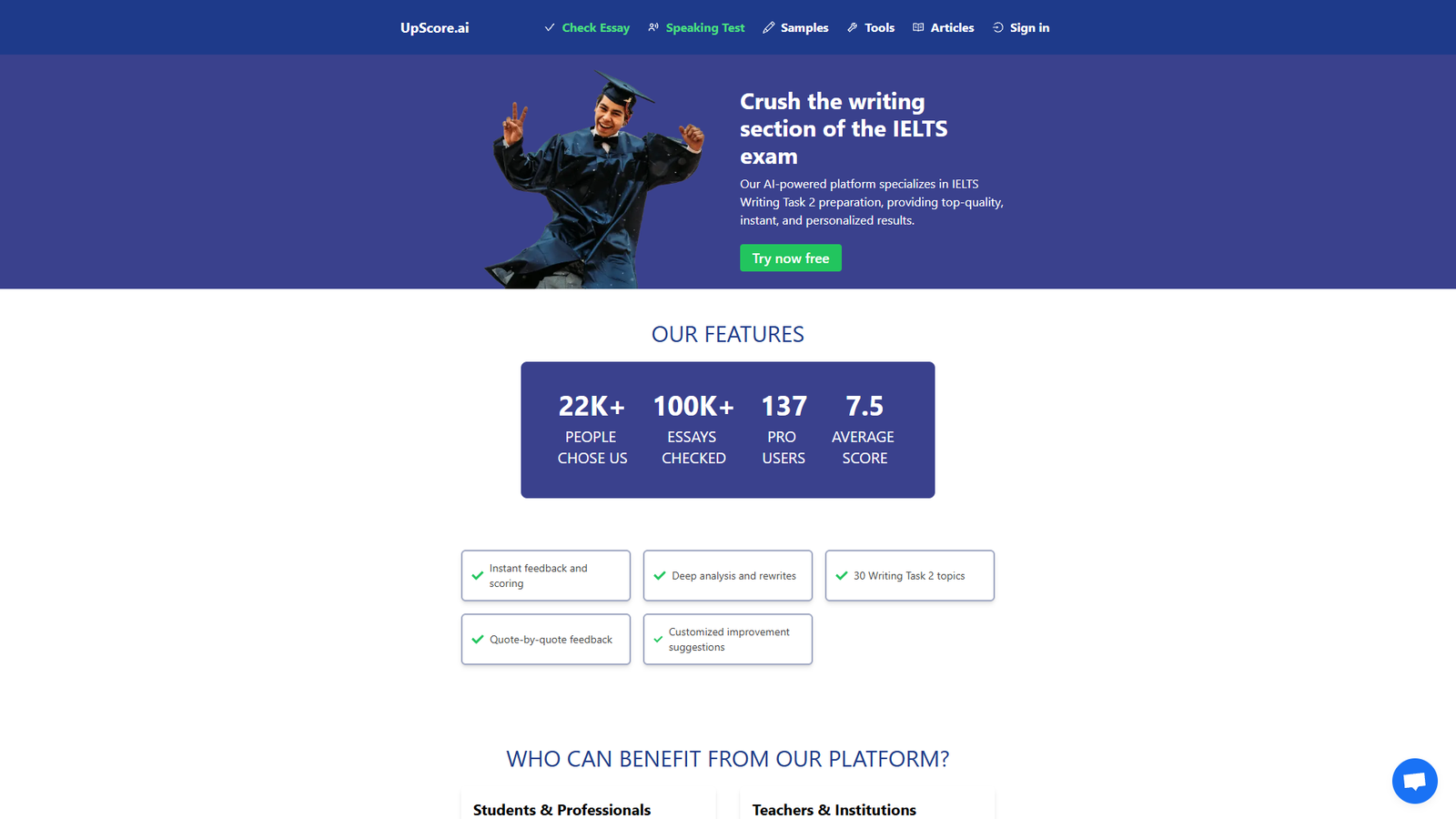 Сервис подходит выпускникам школ, студентам и работающим специалистам, которым нужен конкретный целевой балл IELTS для учёбы или иммиграции. UpScore.ai помогает системно готовиться, экономя время на проверке и давая понятный план роста по письму.