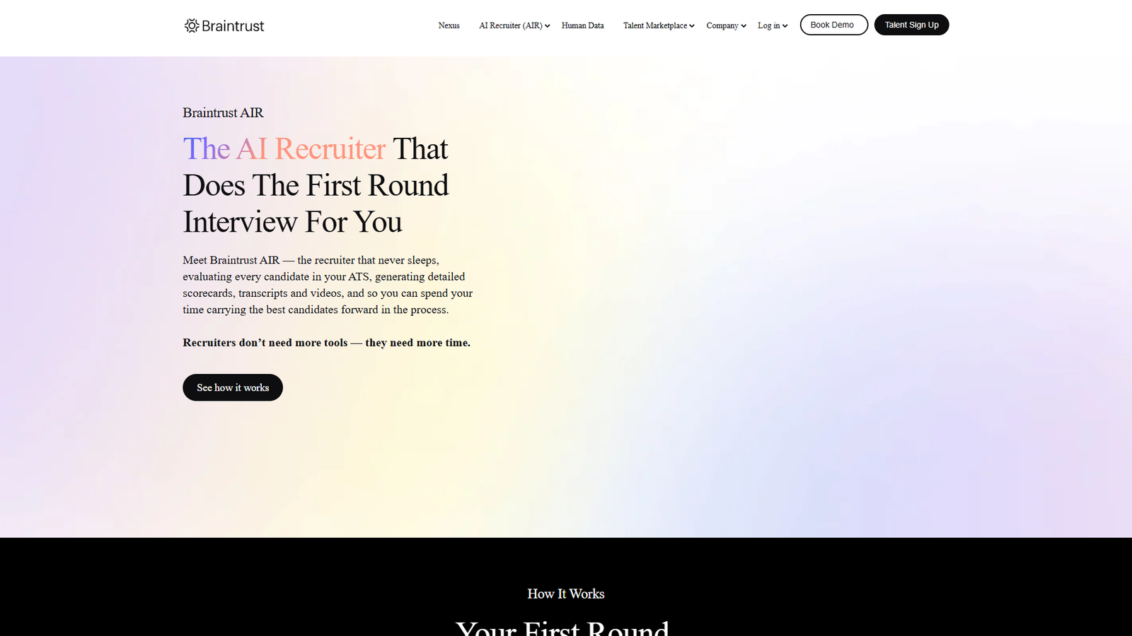 Braintrust AIR — это ИИ-рекрутер, который берет на себя весь первый раунд собеседований. Инструмент подключается к вашей системе отслеживания кандидатов (ATS), анализирует отклики и проводит стандартизированные интервью без участия человека.