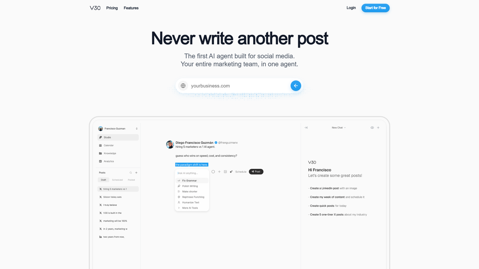 V30 ориентирован на тех, кто развивает личный бренд или B2B-продукт через LinkedIn и X. Инструмент подходит основателям, маркетологам и создателям контента, которым важно регулярное, осмысленное присутствие в ленте без потери часов на ручное написание постов.