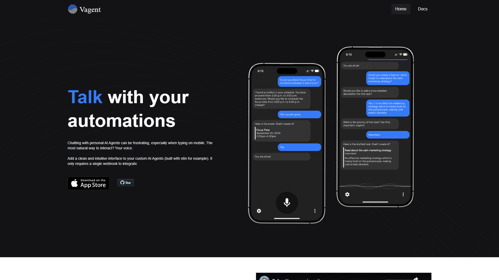 Vagent — это сервис, который превращает ваших кастомных AI-агентов в удобных голосовых ассистентов. Вместо утомительного набора текста, особенно на мобильных устройствах, вы просто разговариваете с автоматизацией так же естественно, как с человеком.