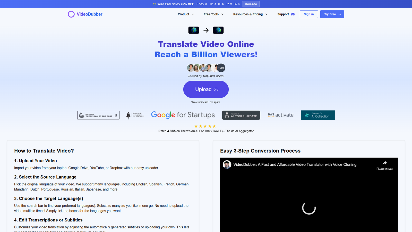 VideoDubber Translate Video — онлайн‑сервис для быстрого и точного перевода роликов на более чем 150 языков. Платформа сочетает нейросетевой перевод, клонирование голоса и естественное озвучивание с разными акцентами, помогая авторам выходить на глобальную аудиторию без сложного монтажа.