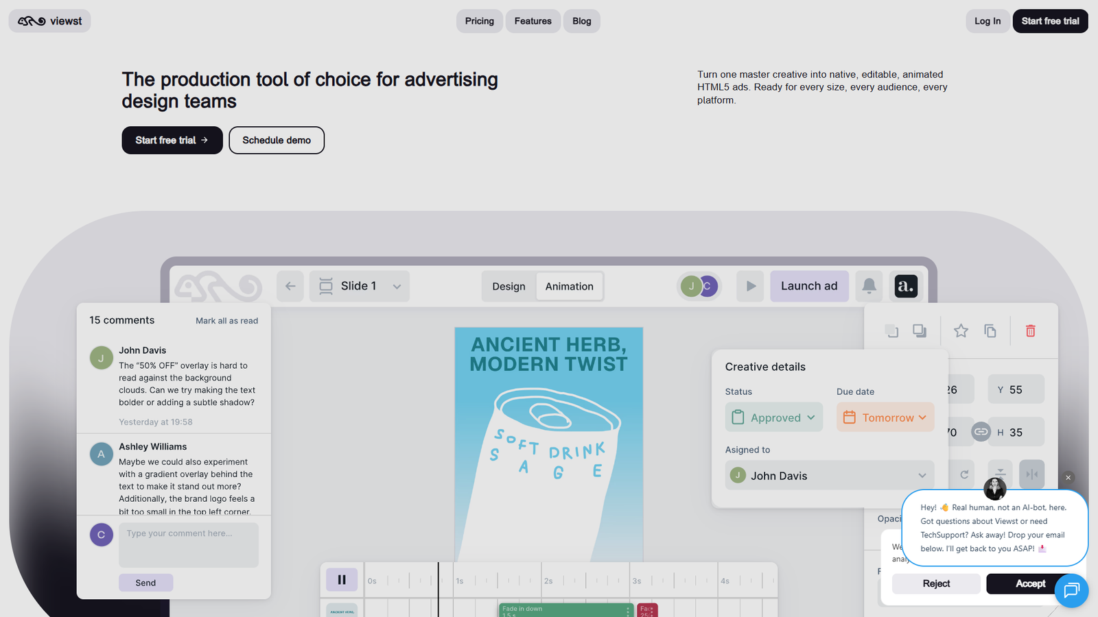 Viewst — это платформа для быстрой и масштабируемой разработки рекламных креативов, которая помогает командам запускать кампании без задержек. Сервис превращает один мастер-креатив в целый набор нативных, редактируемых, анимированных HTML5-баннеров для любых форматов и площадок.