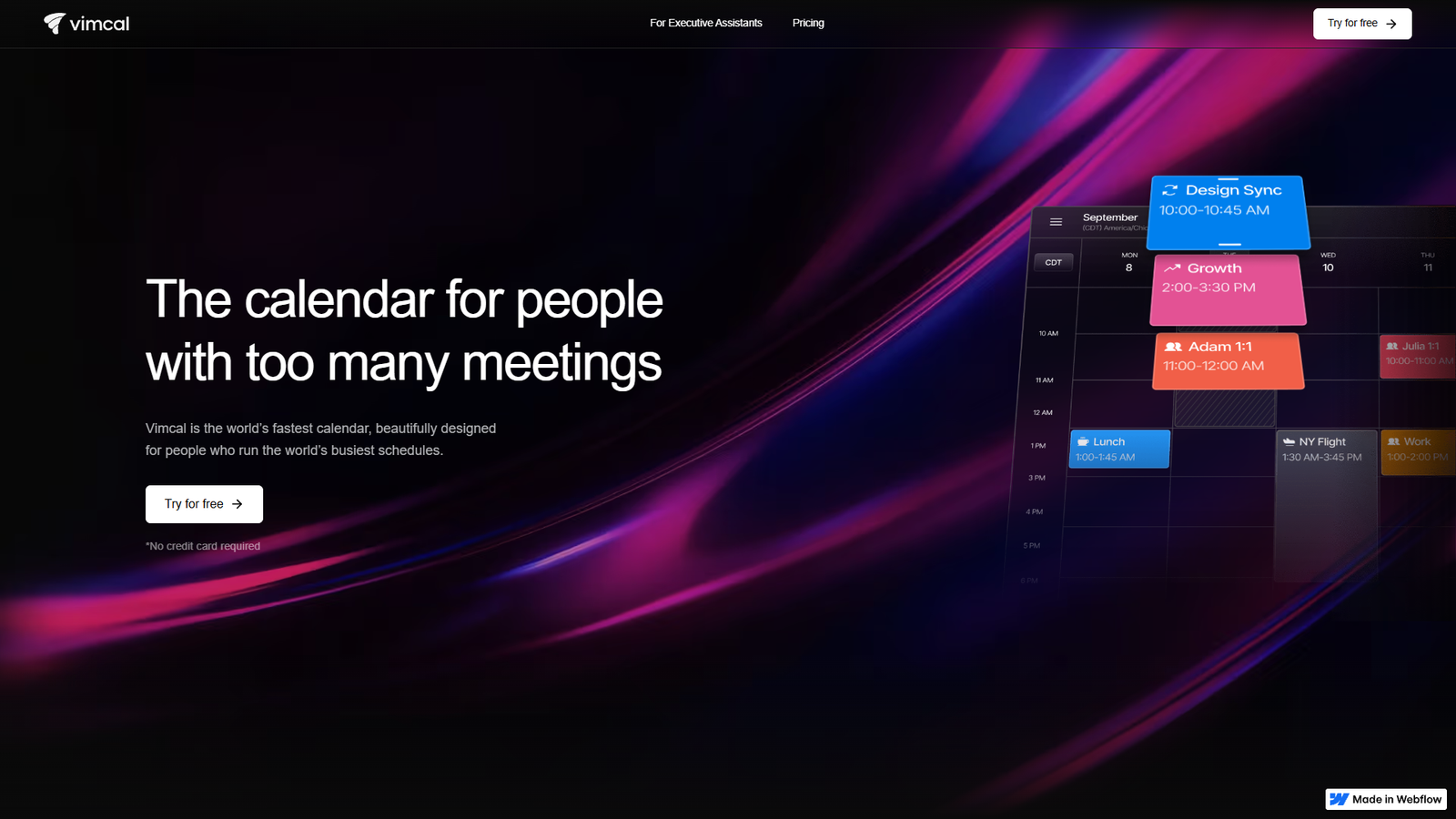 Vimcal — это сверхбыстрый онлайн-календарь, созданный для людей с перегруженным графиком и множеством встреч. Сервис помогает планировать день за секунды, не теряясь между десятками слотов и приглашений.