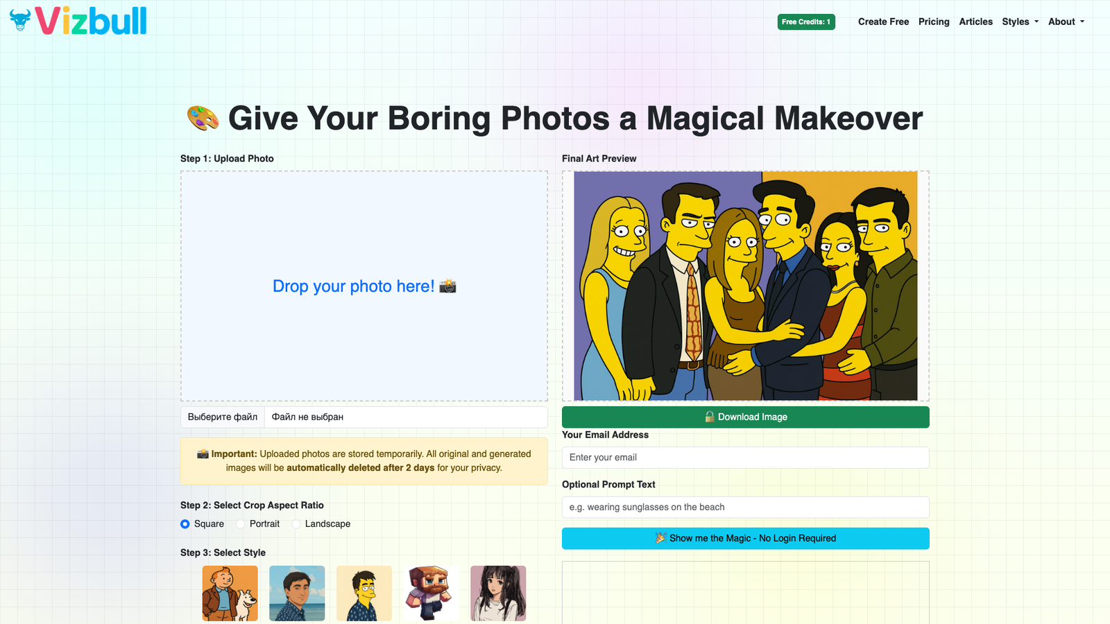 VizBull — онлайн-инструмент для создания фотоколлажей и стилизации снимков с помощью ИИ. Загружаете фото, выбираете формат кадра (квадрат, портрет, пейзаж) и собираете визуальную историю из портретов, путешествий или арт-кадров.