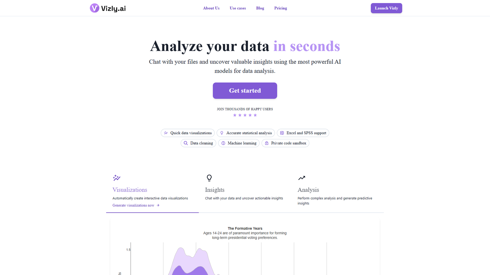 Vizly — это ИИ-аналитик данных, который позволяет анализировать и визуализировать ваши данные за считанные секунды. Вместо сложных формул и скриптов вы просто общаетесь с данными в чате и сразу получаете понятные ответы, графики и выводы.