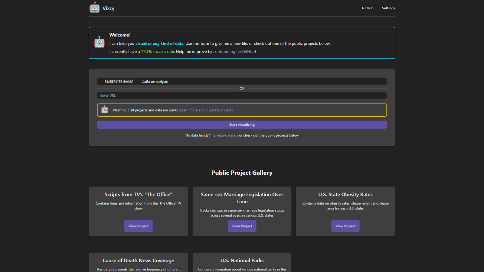Vizzy — веб-инструмент для быстрой визуализации данных с помощью больших языковых моделей. Пользователь загружает файл с данными, а ИИ подбирает подходящий тип графика и строит наглядные диаграммы.