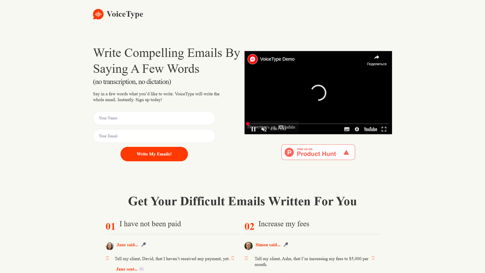 Вы нажимаете на запись, кратко формулируете задачу голосом — например: «Напомни клиенту, что оплаты ещё не было» или «Сообщи, что я повышаю гонорар до 5 000 долларов в месяц». VoiceType анализирует ваш запрос и за секунды создаёт структурированное, вежливое и убедительное письмо.