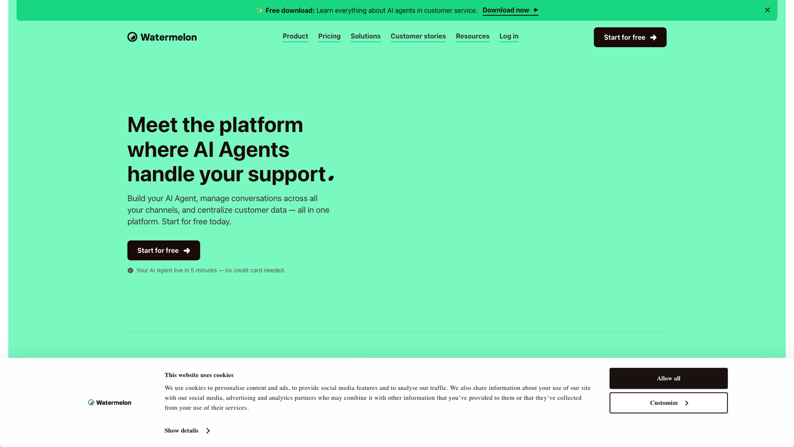 Watermelon — это среда для создания и запуска AI-агентов, которые берут на себя значительную часть клиентской поддержки. Пользователь собирает собственного агента на базе моделей уровня GPT, обучает его на данных компании и подключает к нужным каналам общения.