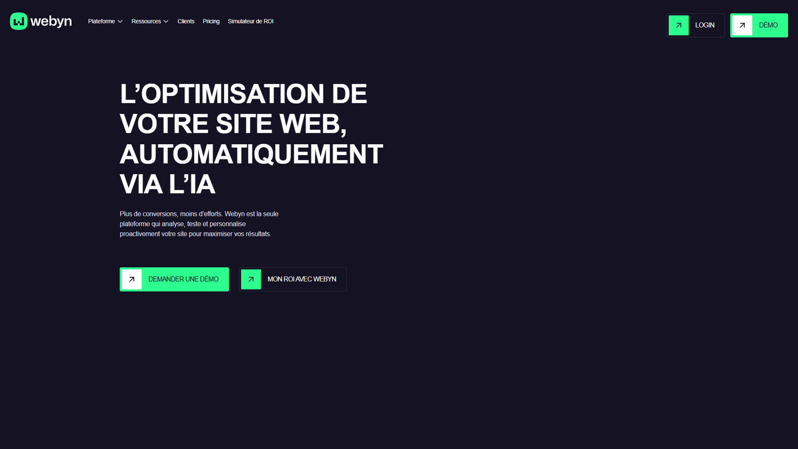 Webyn — это платформа для автоматической оптимизации конверсий сайта с помощью ИИ, которая объединяет анализ, A/B‑тестирование и персонализацию в одном решении. Сервис помогает понять, что именно мешает посетителям конвертироваться, и автоматически предлагает варианты улучшений.