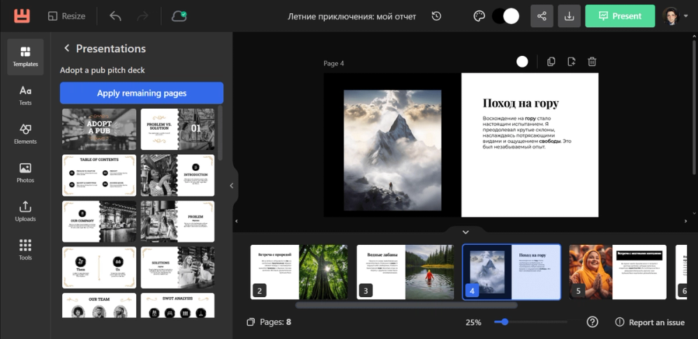 На сервисе можно заранее сгенерировать текст и картинки для проекта. Wepik на русском понимает запросы так же хорошо, как и на английском. Поддерживаются другие языки. Предусмотрена функция редактирования документов.