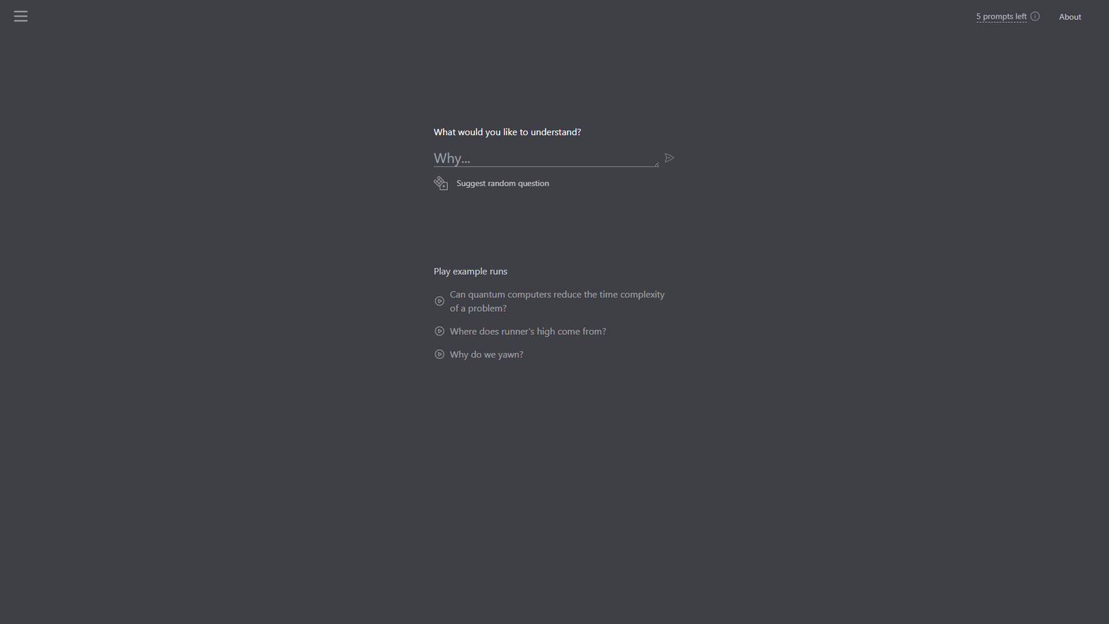 Сервис предлагает ввести любой интересующий вас вопрос или сгенерировать случайный — например: «Могут ли квантовые компьютеры уменьшить временную сложность задачи?» или «Почему мы зеваем?». Whybot использует модель Researcher GPT-3.5 Turbo, чтобы давать развернутые, логичные и последовательные ответы.